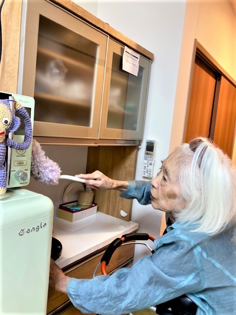 再転倒・骨折の危険性がある為、お掃除中もしっかり歩行器に