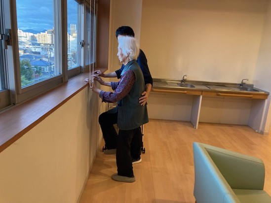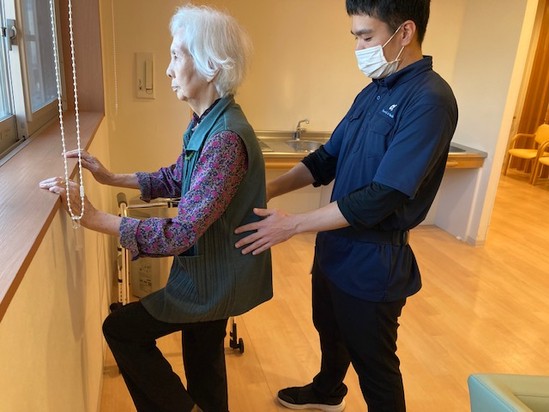 2025年11月10日(月) 訪問看護でのリハビリ中 こんにちわ~アルファリビング観音本町です廊下で、何やら楽しくしていたので写真を撮らせて頂きました(^^♪ 普段は腰が痛いと言われ、最近はふらつきもあるA様 楽しそうにリハビリされていました このような運動が入居者様の生活を守っています