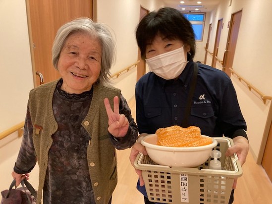 2026年01月13日(火) 寒い日こそ入浴(^▽^)/ こんにちはアルファリビング観音本町です 最近は本当に寒い日が続いてお風呂に入るのも億劫な日が多いですよね…(笑) ご入居者様の皆様もお風呂のお声がけに「寒いけんねえ…」とお気持ちが向かない日もありますが… 職員さんのあの手この手のお声がけに「行ってみようか」と立ち上がってくださいます 体調に変わりはないかを確認しながら… 一緒にお着替えを選んで… いざお風呂へ 素敵な笑顔のお二人に思わず私も笑顔になりました!(^^)! これからも寒い日だからこそしっかりとお風呂に浸かって身体を温めていただきたいと思います