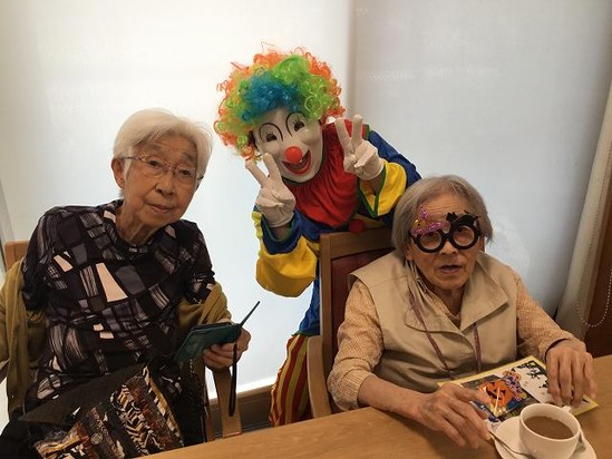 皆さん普段みるスタッフが仮装して現れたことでとても喜ばれておられ、一緒に写真撮ろうと引っ張りだこです(笑)