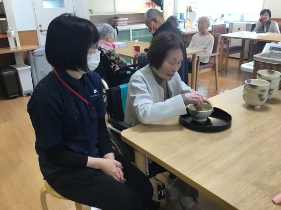 女性の入居者様は若かりし頃に花嫁修業でお茶を習っておられた方がおられ、「もうずいぶん昔のことで忘れた(笑)」と謙遜されてましたが・・・