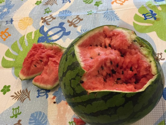 なかなか割れませんでしたが、14人の利用者様に叩かれて、スイカも割れてくれました