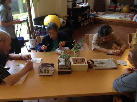 2014年07月21日(月) ブローチ作り これは金曜日ですが皆さんでブローチ作りをしました。 クラフトテープを切ってボンドで張るという簡単な作業でしたが、きり方にもそれぞれ個性があっていい作品が出来そうでした。 皆さん一生懸命ですね~完成が楽しみです(^_^)