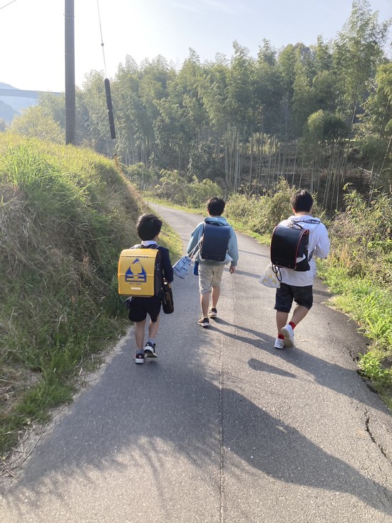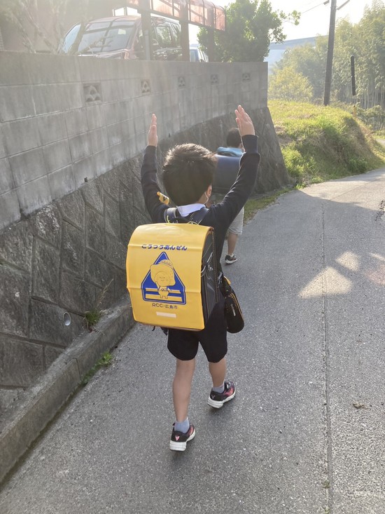 初登校!なぞのポーズで登校中です(-"-)