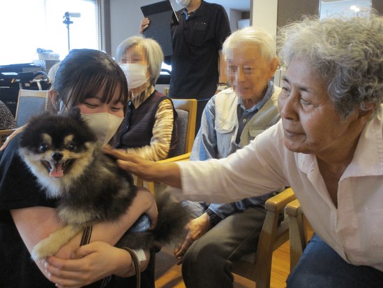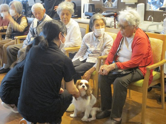 アニマルケア専門学校様より、2名の先生と5名の生徒さん、計4匹のわんちゃん、モルモットたちにお越しいただき、動物たちとのふれ合いタイムに入居者様も大満足
