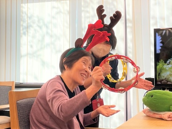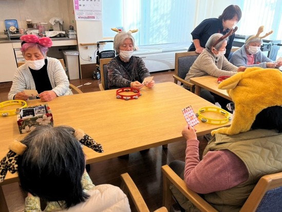はじめにご利用者の中で希望された方に被り物をしていただき、みんなでクリスマスソングを歌ったり演奏したりしました