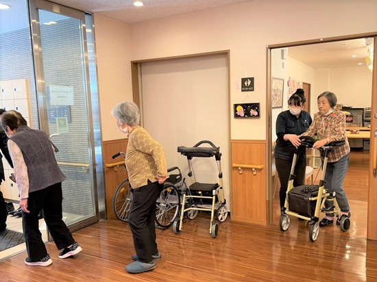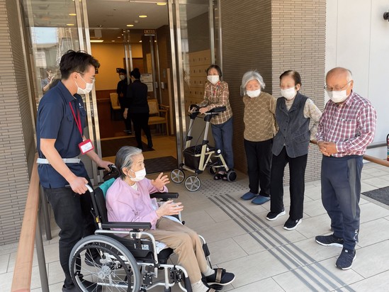 デイサービス利用中の皆さまにもご協力いただき、正面玄関先まで避難。