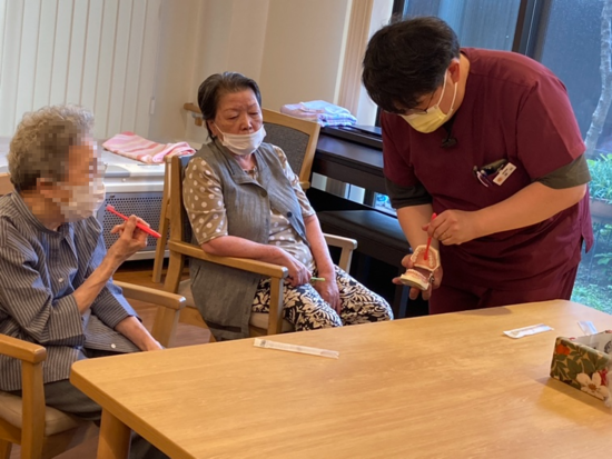 2025年06月25日(水) 歯みがきの大切さ! こんにちは!アルファデイサービスセンター吉島通です(^^♪ いつも訪問歯科でお世話になっている広島市中区光南のおひさま歯科の先生方にお越しいただき、歯みがき研修会を開催していただきました!!! 先生からは「一筆書きのように10分くらいかけて!」とか「間食は食間ではなく食後に摂って歯みがきを!」 など虫歯にならないための貴重なアドバイス♪ ご利用者様の質問にも答えてくださり、歯の裏側の磨き方や歯間ブラシの使い方を教えてくださいました(*^^)v やはり健康な歯を守るためには”丁寧な歯みがき”が大切ですね(^o^)/