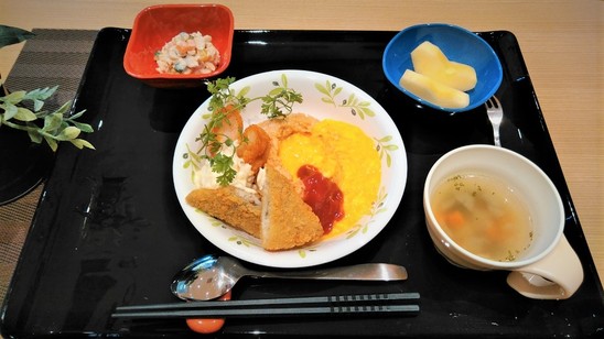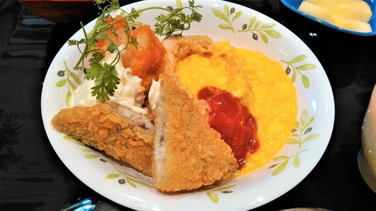 オムライスの中に魚のフライが入り、またエビフライも~~