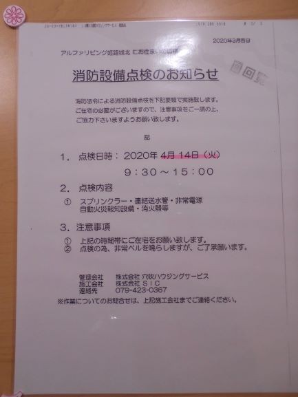 アルファリビング姫路城北の消防設備点検のお知らせ