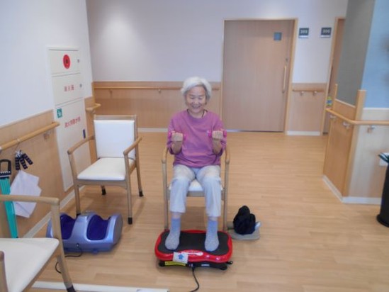 運動場では、足のブルブルマッサージとダンベルを使い一度に2つ運動をされて