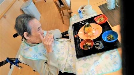 桜の型どりをしたちらし寿司を前に入居者様もほっこり笑顔です。