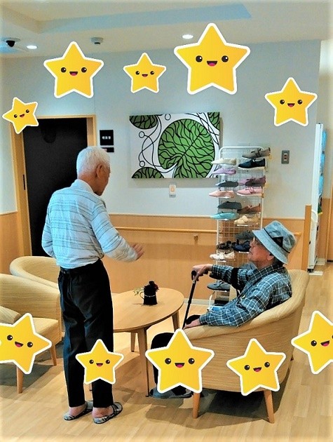 2021年06月23日(水) 男同士の談義 事務所前で何やら楽しそうに話をされている男性陣を発見 最近入居されたT様 早速仲良く話ができる入居者様が見つかり 見ているこちらも嬉しくなり、思わず 隠し撮り