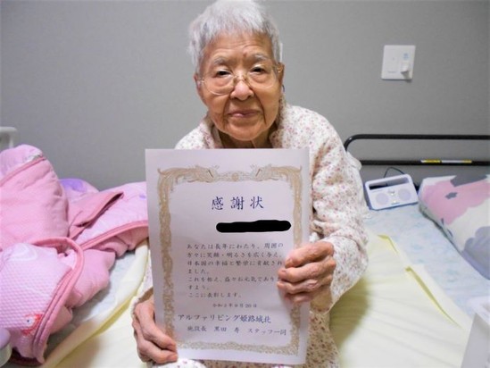 2021年09月25日(土) 敬老の日 パート4 今回はお部屋まで伺って記念撮影 皆さん、いい笑顔で写ってくれています ピースまでしてくれてますね 皆さん、これからも末永く元気いっぱいで過ごしてください