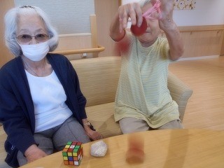 2022年10月17日(月) 手遊びの会 皆様、こんにちは今日は、自然と集まっておられた入居者様が何をされているのか伺いました。昔、流行っていた「お手玉・あやとりよ~~」 「ほいほいっ!!」と巧みに操っておられます。 さすがです~~~先輩。