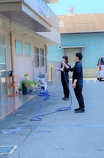今日は、皆様がご来場される玄関の窓掃除です。