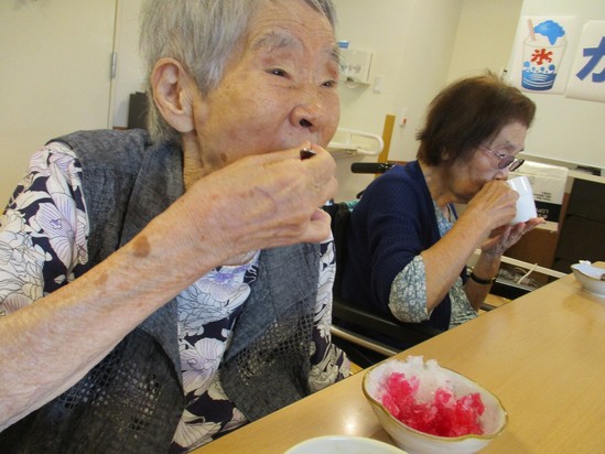 2024年08月16日(金) かき氷~デイサービス~ 「味、何にしよかな~!?」とワクワク・・・ 「みて!私、マンゴーにしたんよ(^^♪」と満面の笑み★ 「懐かしいね~!!」と素敵な笑顔(#^.^#) 季節を感じられた瞬間でした(^_-)-☆