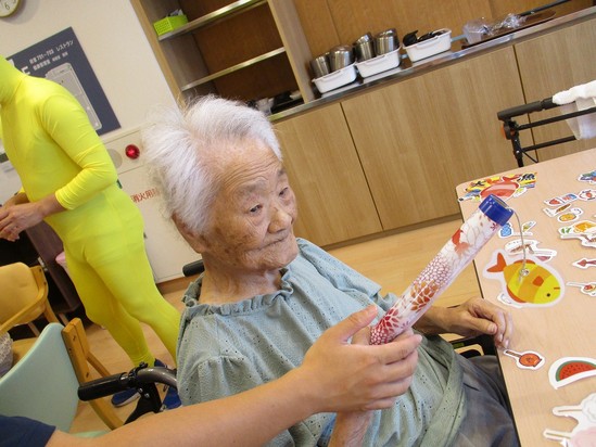 デイサービスでご利用者様に作っていただいた夏のモチーフを使って魚釣り♪