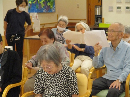 2024年10月01日(火) 毎月恒例の歌の会~デイサービス~ デイサービスが城西で行っている「歌の会」に参加した来ました!! 秋の歌がたくさん★ 旅愁、里の秋、小さい秋、みかんの花咲く丘など・・・・ 次はコスモスが歌いたいとのリクエストもありました♪ 練習しておきます!!