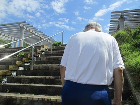 今日の午前中は少し曇り空で風もあったので屋外歩行訓練で名古山の仏舎利塔に行ってきました