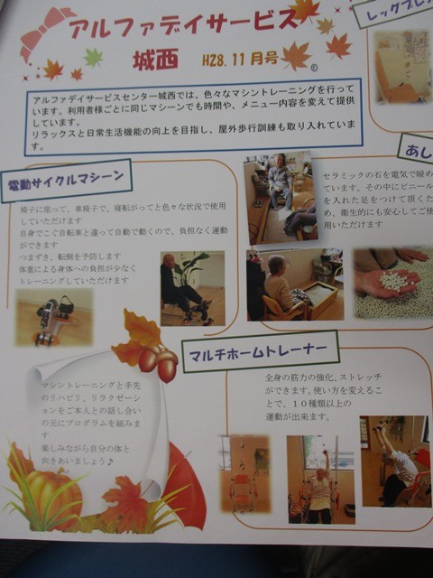 2016年10月25日(火) アルファデイサービス通信11月号 デイサービス通信11月号が発行されました。今月はリハビリ特集となっていますマシンを使ったトレーニングや屋外歩行など、なるべく筋力を落とさないようにと皆様意識されながら訓練を行っています。
