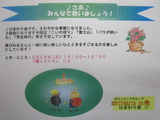 2017年05月17日(水) 歌の会のお知らせ 2月に来てくださった「ひまわり会」さんが、今月もアルファリビング姫路城西に来てくださいます 懐かしい歌をみんなで歌いませんか? 入居者様はもちろん、ご家族、地域の皆様もぜひぜひご参加ください。