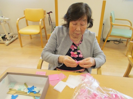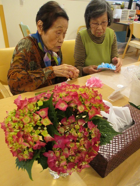 2018年06月28日(木) アジサイの花 ~デイサービス~ ご利用者様のご家族より庭に咲いていたあじさいの花を頂きました。赤がかったピンクの珍しい花で「もう、アジサイが見られるなんて」と皆様興味深々★ デイサービスの壁画のあじさいも仕上がりに近づいています♬