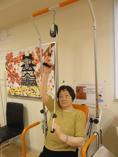 滑車運動を用いて行う例として、五十肩(肩関節周囲炎)によって肩が上がらなくなった、骨折後関節が硬くなった、脳梗塞の後遺症で上肢の動きが悪くなったなど、運動機能障害に対して行うことが主になります。筋力増強、矯正による関節可動域の改善、本人自ら患側を動かすことで、建側と患側の協調性の獲得などさまざまな効果があります