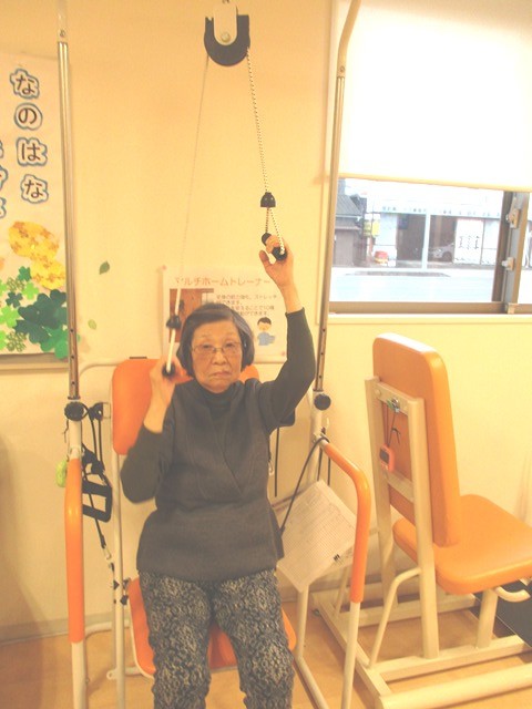 2019年05月14日(火) 滑車運動~デイサービス~ 滑車にロープをつけ、両手で引っ張る運動です。筋肉増強、血行促進、関節可動域の改善などに効果があります。 加齢により肩が上がらなくなった…といわれる方が多いので少しでも改善できればいいな、と思います。