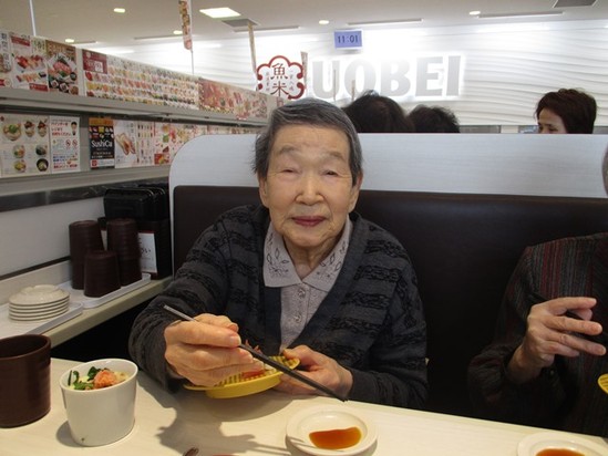 2019年04月10日(水) お寿司ツアー~デイサービス~ 今日はデイサービスから回転寿司を食べに行ってきました 茶碗蒸しにマグロにハマチに・・・・・ たくさん食べてニッコリ 「おいしかったよー!!!!」 と笑顔、笑顔 また、行きましょうね