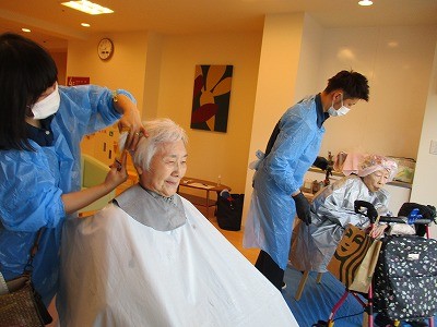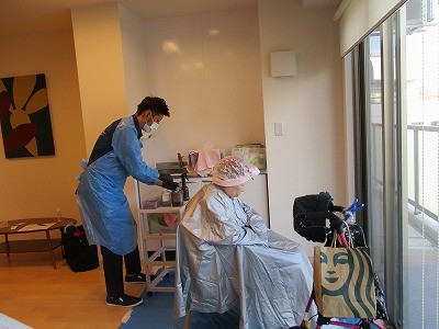 2020年11月25日(水) 訪問理美容 月に一回の訪問理美容の日です(#^.^#) 皆様、楽しみにしておられ、防護服にマスクをしていただき、感染対策の上 実施させていただきました♪ 美容師さんとのお話も少しだけお預けですが、さっぱりしたと素敵な笑顔をいただきました☆