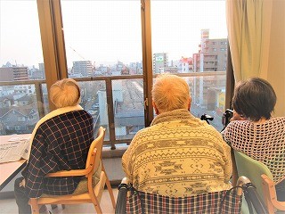 2020年12月14日(月) 毎朝の日課です。 おはようございます!!と言わんばかりに、天気のいい日は朝日がビルの間から顔を出します。そして、毎回、入居者様のご挨拶が日課となります。今年度もあと少し、来年は良い年でありますように