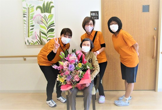 2021年03月26日(金) 誕生日だそうですぅ(恥ずかしながら・・・) 今日で、○○歳になったY様ご家族様3人より、花が届きました。せっかくなので、スタッフと一緒にパシャリ お誕生おめでとうございます