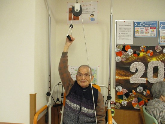 2022年01月29日(土) ただいま運動中~デイサービス~ 滑車を使った腕の上下運動です! やってみると、肩の筋肉がグイっと伸びて気持ちが良いんです(*´▽`*) こちらはレッグプレスを使った足の運動です。 腰に負担を極力掛けずに足の筋力アップを目指しています♪