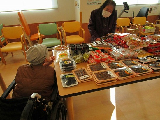 2022年01月30日(日) 訪問販売 皆様が楽しみにしていらっしゃる「訪問販売」の日でした 感染対策をしながら、入っていたいただく人数も制限させて頂いています。 「マスクしていくわね」「消毒してもらったわよ」 とお互いに声をかけながらのお買い物です♪♪