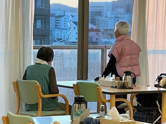 2022年02月14日(月) 朝のひと時・・・ まだ暗い朝・・・・窓の外を見ているT様とY様・・・・ 何を見ているのでしょう???? 朝日が昇るのを待っておられるようです! アルファリビング姫路城西のレストランは七階! 朝日も夕日もきれいですよ(#^.^#)