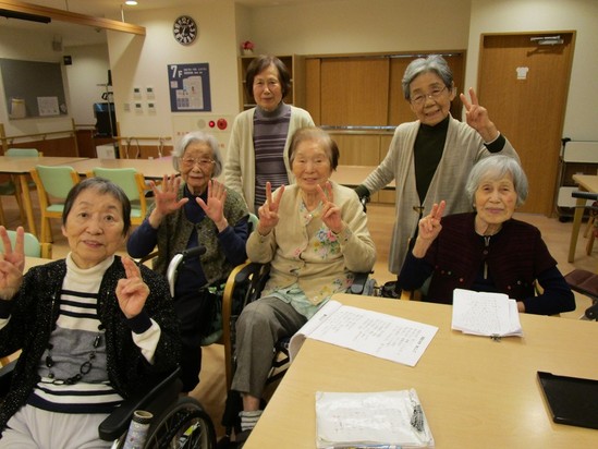 2022年03月25日(金) 毎月恒例の・・・・ 毎月恒例になっている入居者様主催の「うたの会」 の風景です。 感染対策をしての実施です! 今までのようには行かなくても、少しでも集まりたいと試行錯誤しながら行われています♪ みんな揃って・・・・はい、チーズ♪