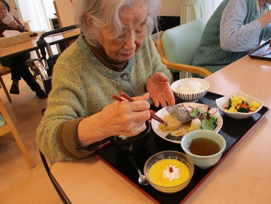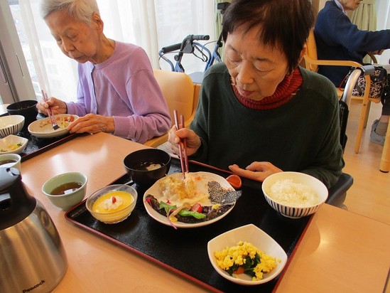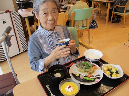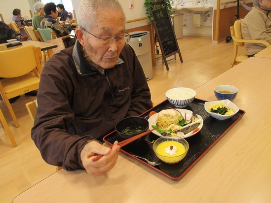2022年04月14日(木) レストランみたいな・・・・・ 「レストランの食事みたいやね~!!」 と好評だった昼食の一コマをご紹介します(●´ω`●) 馴染みの少ないチリソースにおっかなびっくり・・・ 「あら!?おいしい(●´ω`●)」 ご満悦でした♪♪