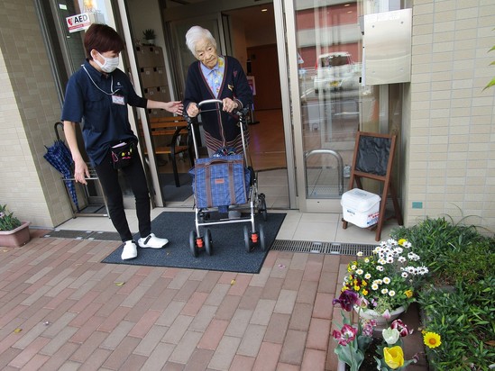 2022年04月24日(日) こんにちは、訪問看護です♪ 玄関までの歩行訓練( *´艸`) 春を探しにまいりました!! 「いや~♪きれいなチューリップやんか!!」 笑顔いっぱい はい、チーズ(#^.^#)