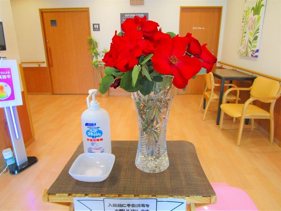 2022年05月24日(火) お出迎え 出入口入ってすぐ出迎えてくれたのは きれいな赤色のお花(^_^) 施設長の家で大事に育てられました! とっても華やかですね K様も「変わったはなびらの形できれいね」 と見入ってました(*^_^*)
