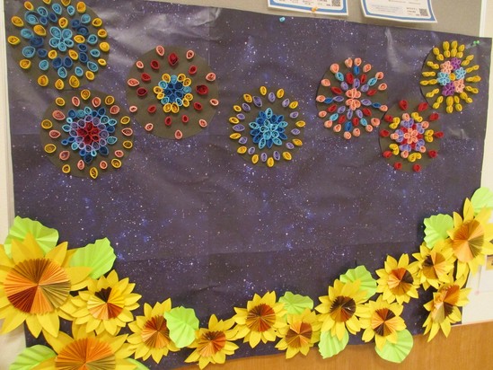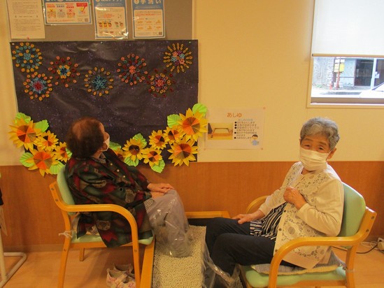 2022年08月14日(日) 8月の壁面~デイサービス~ デイサービス8月の壁面が出来上がりました♪ ひまわりと花火!! 夏らしい仕上がりとなっています( *´艸`) 「綺麗にできたやない♪♪」 とお褒めの言葉を頂きました(^_-)-☆