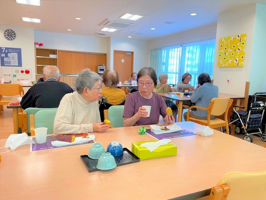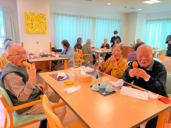 2022年10月21日(金) 秋のイベントお芋会!① 3か月に1度の食事イベント! 今回は秋ということでお芋です(*^^*) こちらのおいも やわらかく! そして程よく甘く!大好評でした! カメラ目線ではいチーズ(*´ω`*) 美味しいお芋に会話も弾んでるようです (*^▽^*) まだまだ写真があるのでまた明日 お楽しみに!