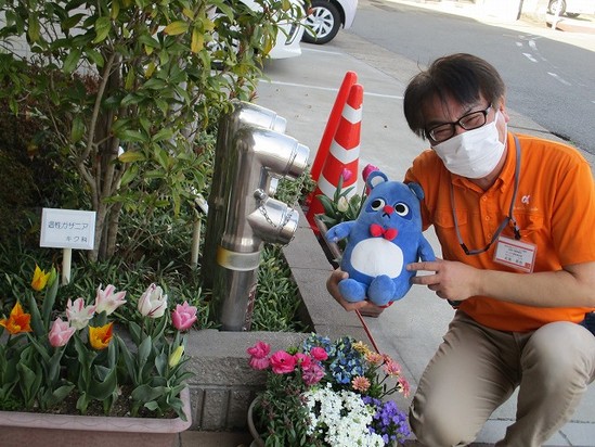 2023年04月09日(日) さいた♪さいた♪チューリップの花が♪ アルファリビングの玄関に素敵なチューリップの花壇が!! あーなちゃんと共に見に行ってきました♪♪ 北条サ責が通りかかったので一緒にパチリ(*´▽`*)