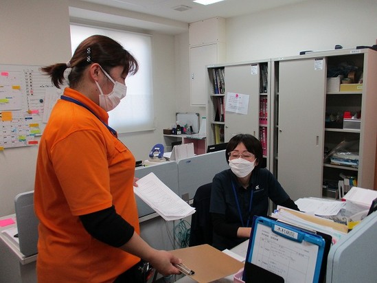 2023年04月10日(月) 訪問看護ってどんなことしてるの~?(●´ω`●) 事務所にて清水管理者と訪問看護の高嶋さんがご入居者様のプランについてお話し中! 訪問介護、看護、が住宅内にある為、変化後すぐに対応できるのが良いところですね(^_-)-☆
