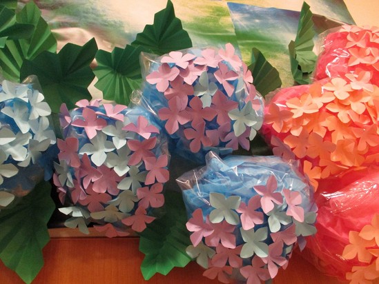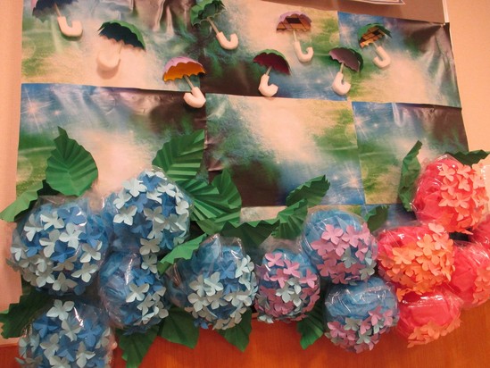 2023年06月20日(火) 6月の壁面~デイサービス~ 紫陽花の花が満開に咲きました(^_-)-☆ 皆様がせっせと一つ一つ花を切って下さいました♪ 立体の傘も素敵でしょう!? 「ええのができたね( *´艸`)」 とご満悦で、皆さま来られるたびに褒めて下さいます!!
