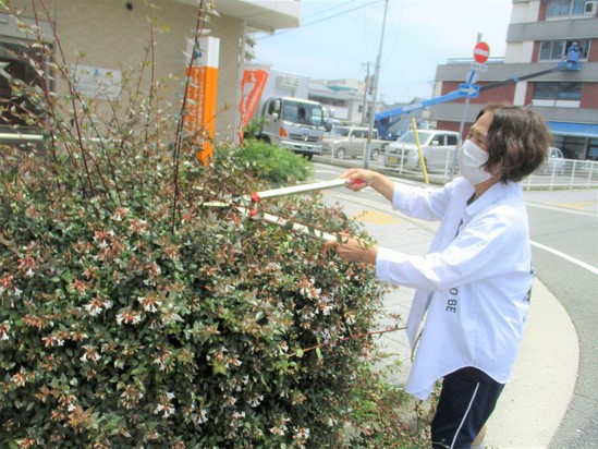 2023年06月28日(水) 職人技(/・ω・)/ 2号線沿いに職人が!!! 「大変よ!!」と大きな鋏を片手に悪戦苦闘しているのは職員の平野さん★ バラから胡蝶蘭までなんでも植物で困ったら相談できる頼れる師匠( ;∀;) いつもありがとうございます!!