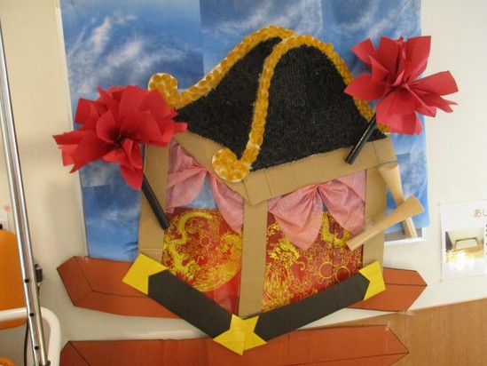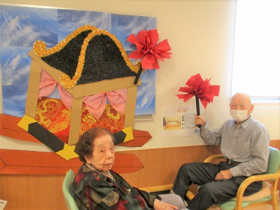 2023年10月13日(金) よーいやさー!!~デイサービス~ 今月のアルファデイサービスの壁面は 「神輿!!」 紙手もつけて、よーいやさー!! それを見たS様が 「太鼓のバチ一緒に飾るか!?」 と貸してくださいました!!