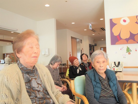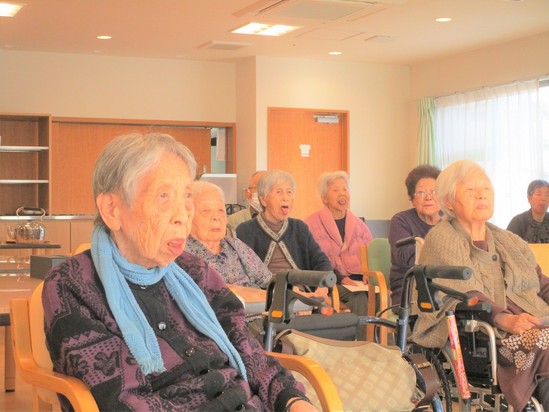 2024年01月12日(金) 歌レク~口腔体操編~ 「上向いて~!!!」 「下向いて~!!!」 首の運動で喉の筋肉を緩めます☆ べーーーーーーーーーーーーっ!!!! 舌の運動もしっかりしましょうね! いつまでも、ご飯がおいしく食べられるように(^^)/