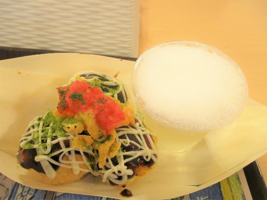 2024年07月10日(水) なにわのお好み焼きランチ② 皆様のおいしいお顔も見ていただきたいのですが・・・・・ これ!!これ!! タコ焼き風のシュークリーム!!! ビール風のリンゴゼリー!! 「凝ったデザートやね!!」と好評でした(^_-)-☆