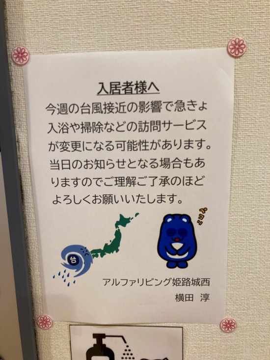 2024年08月29日(木) 台風10号接近に伴うお知らせとお願い 台風10号が近畿地方に接近しております。 接近に伴い公共交通機関の運休等の影響で予定通りのサービス提供が難しくなる可能性があります。 BCPの観点から命を守るサービス提供を優先に実施してまいります。 最低限の出勤可能な職員での対応となります。 ご理解ご協力のほどよろしくお願いいたします。 アルファリビング姫路城西